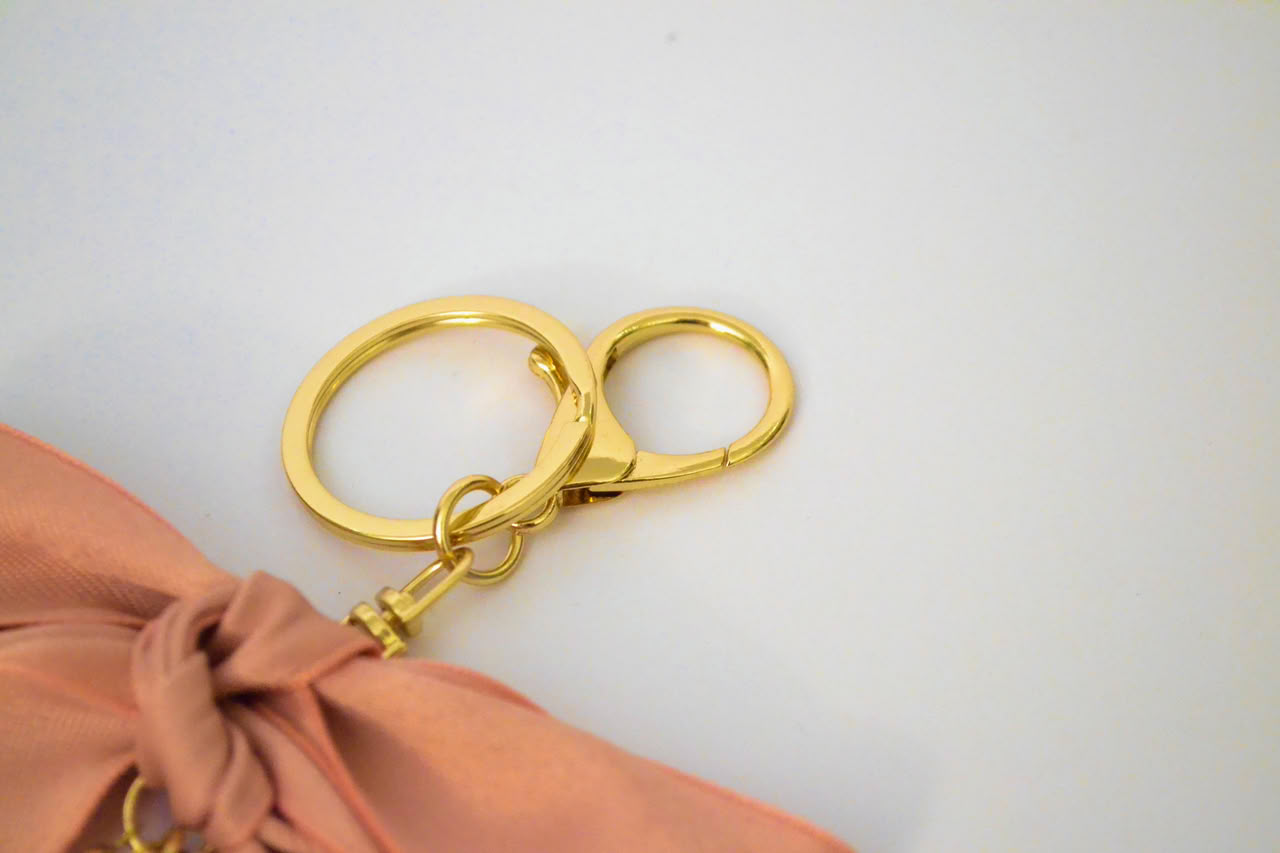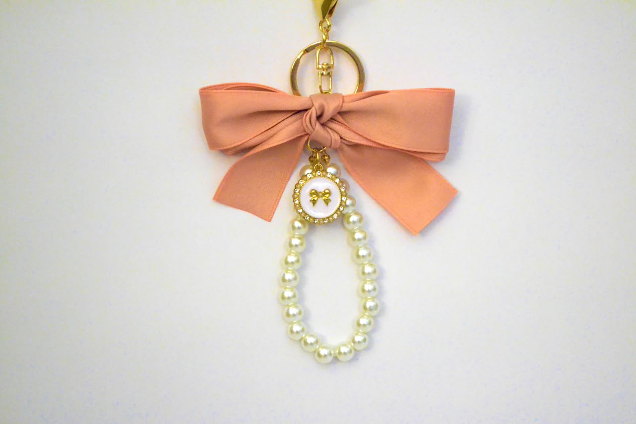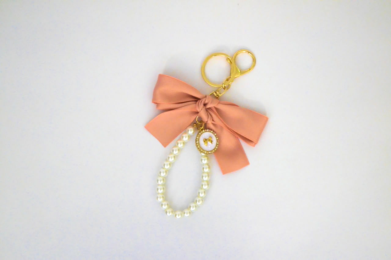 This wristlet keychain features faux pearl beads with a bow-shaped design and a polished metal clasp. Designed to attach easily to bags or keys, it adds a refined decorative touch for everyday use.
