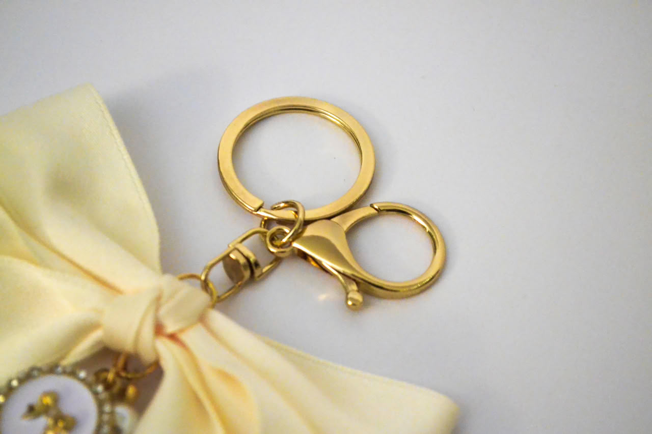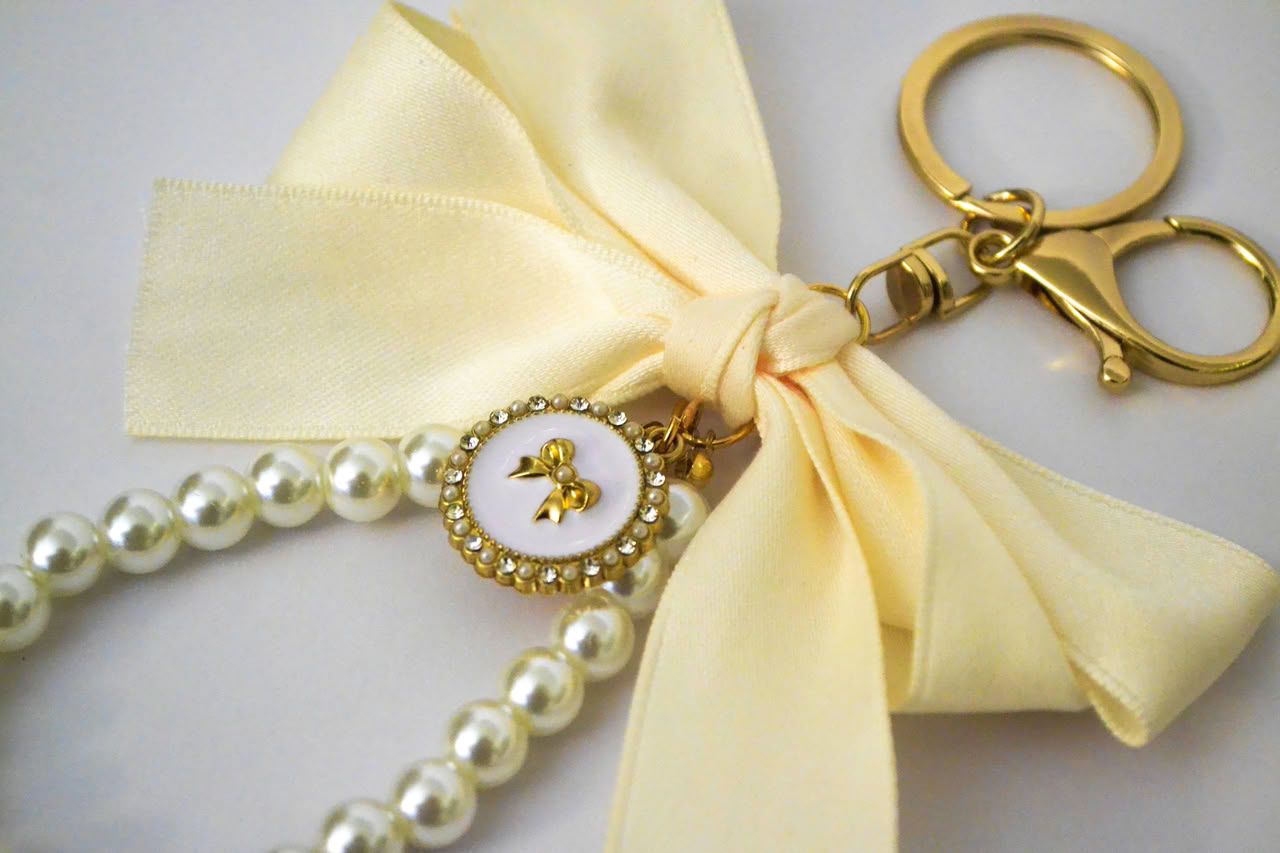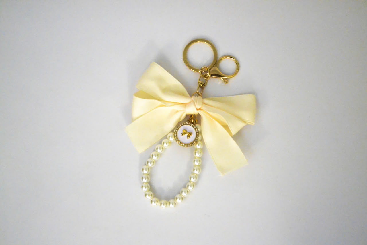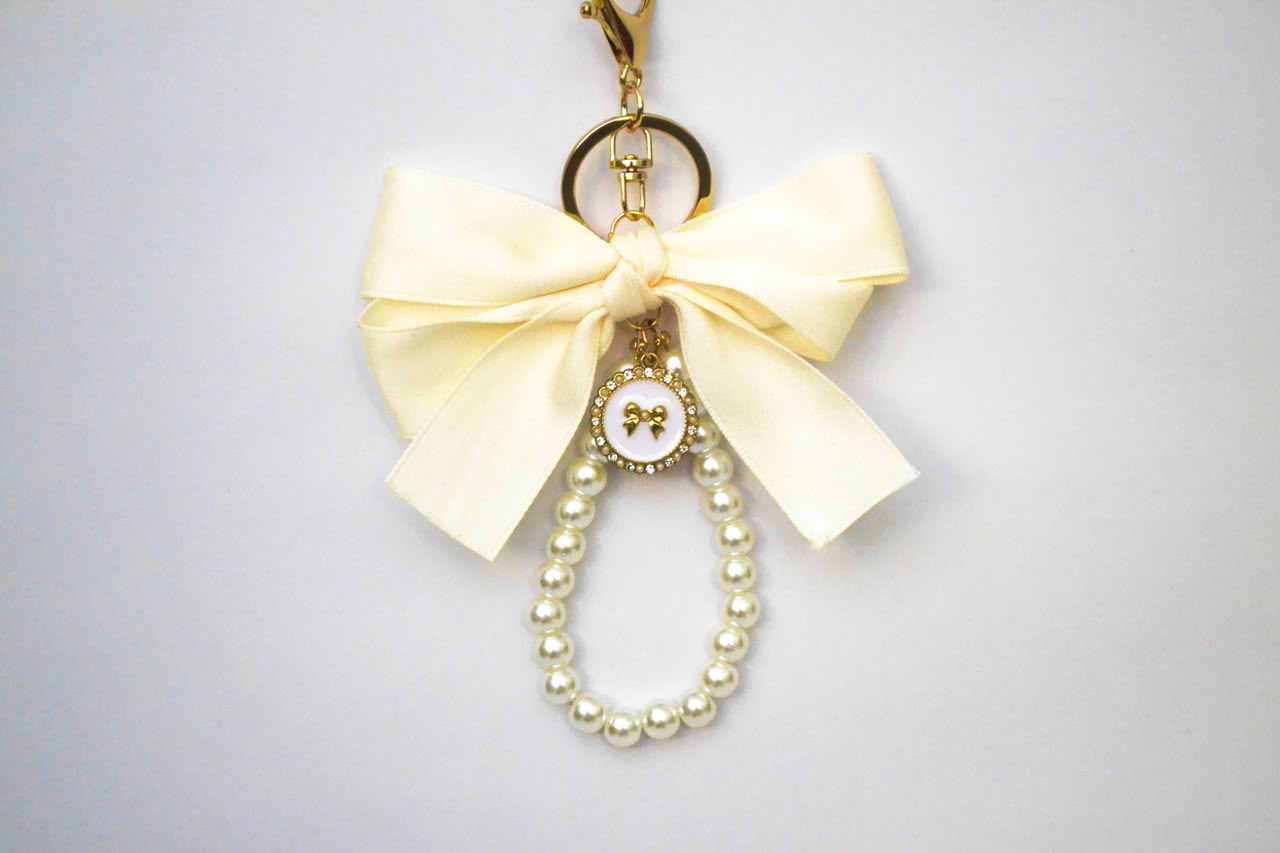 This wristlet keychain features faux pearl beads with a bow-shaped design and a polished metal clasp. Designed to attach easily to bags or keys, it adds a refined decorative touch for everyday use