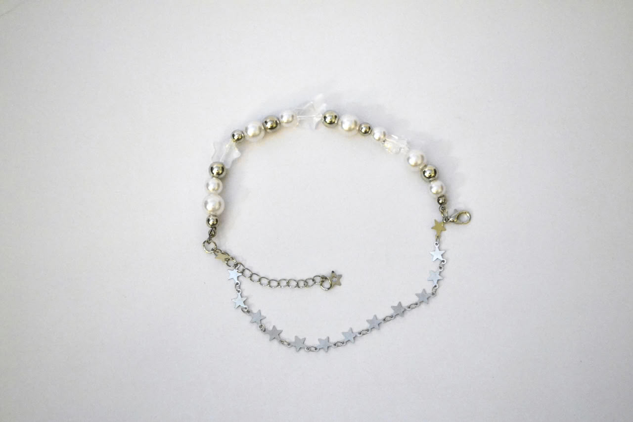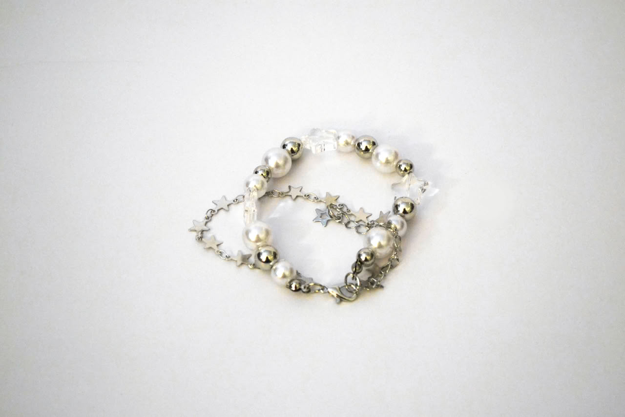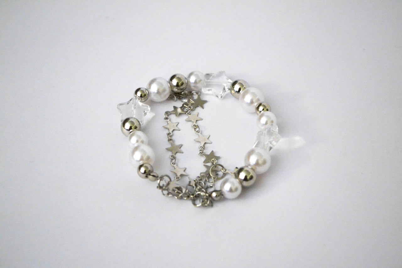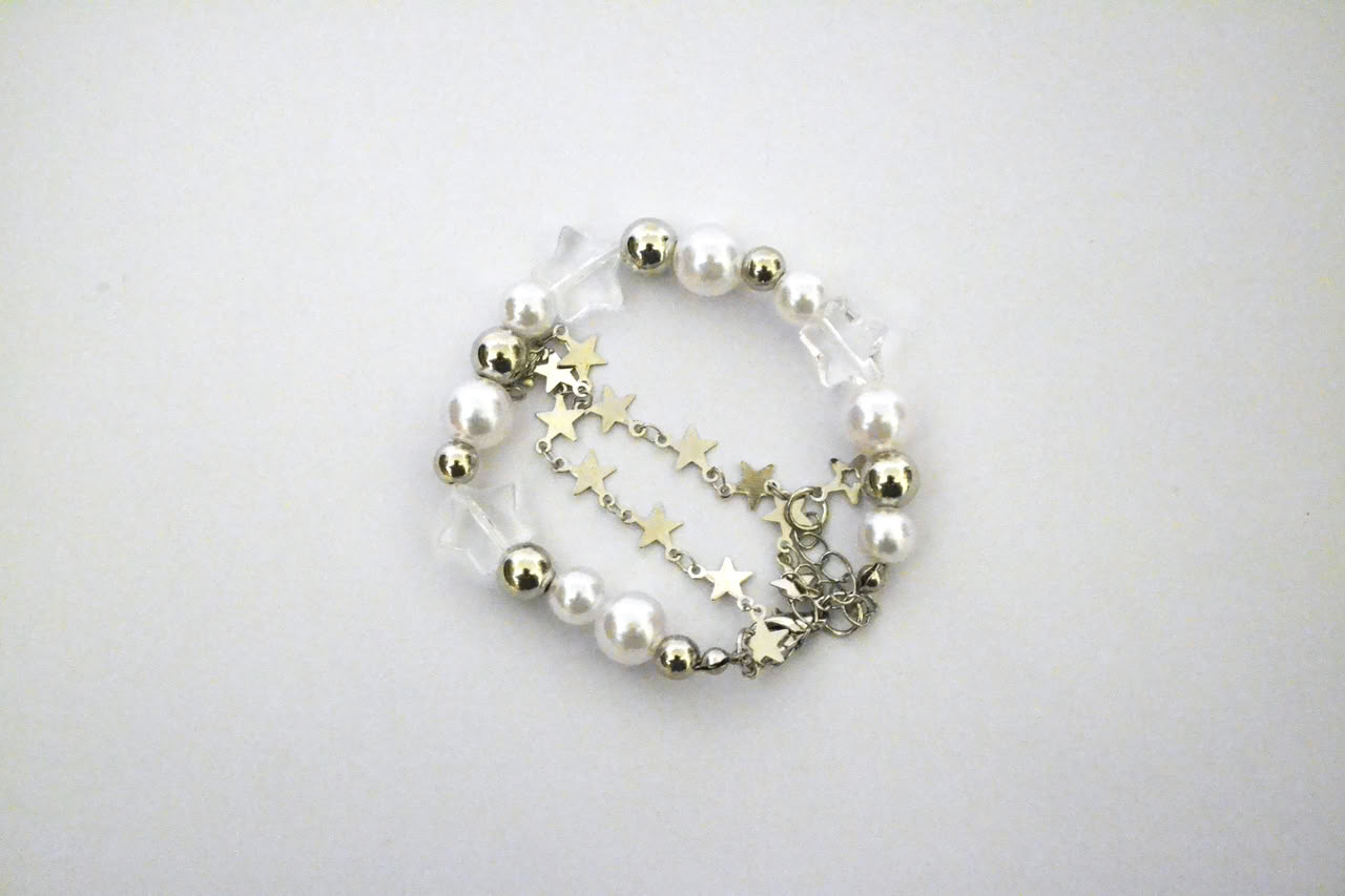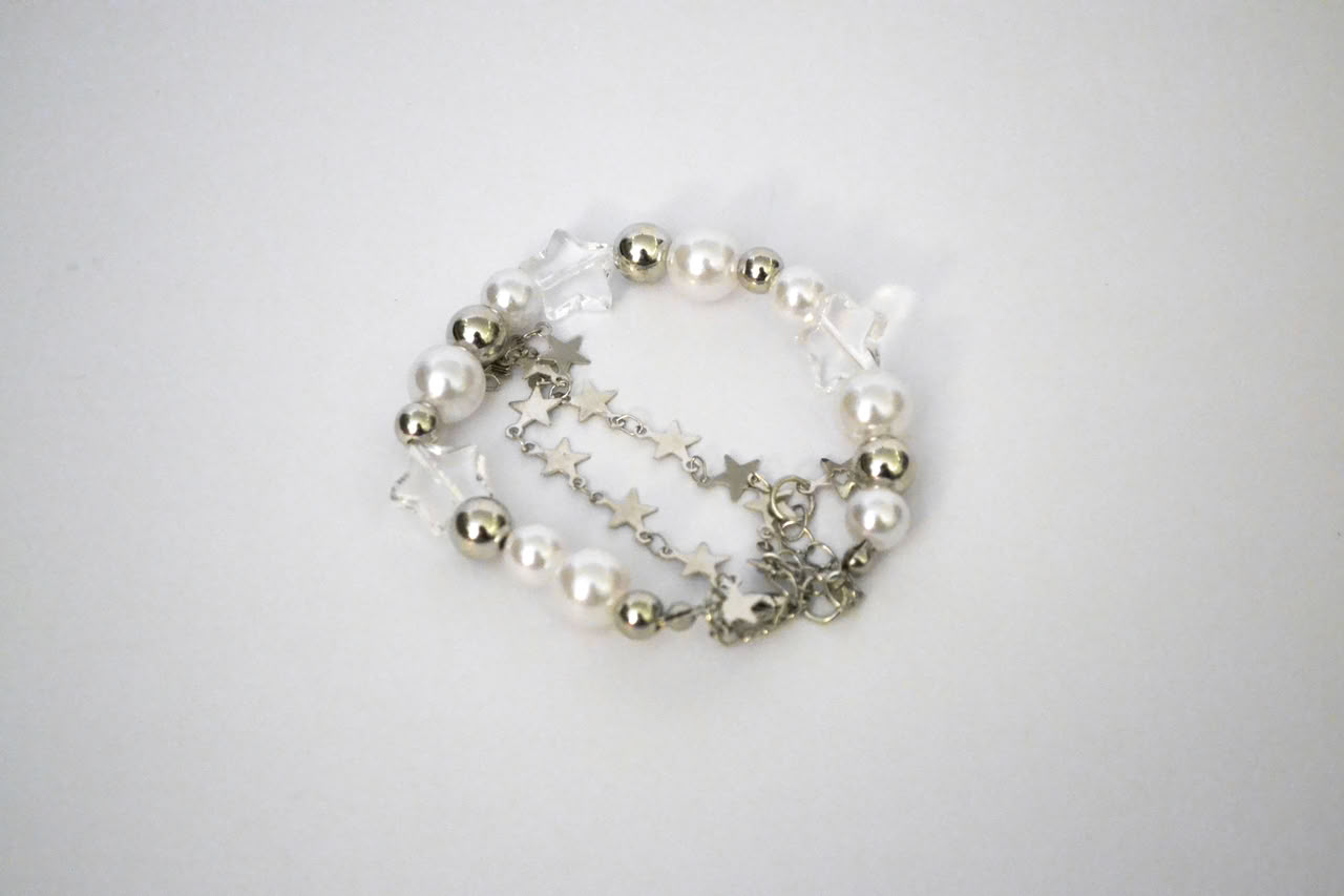 Harajuku Crystal Star Y2K Pearl Beaded Bracelet features a double-layer design with alloy, resin, and imitation pearl materials. The bracelet is 19+5 cm in size, offering adjustability and comfort. Ideal as a gift, it combines style and charm seamlessly.