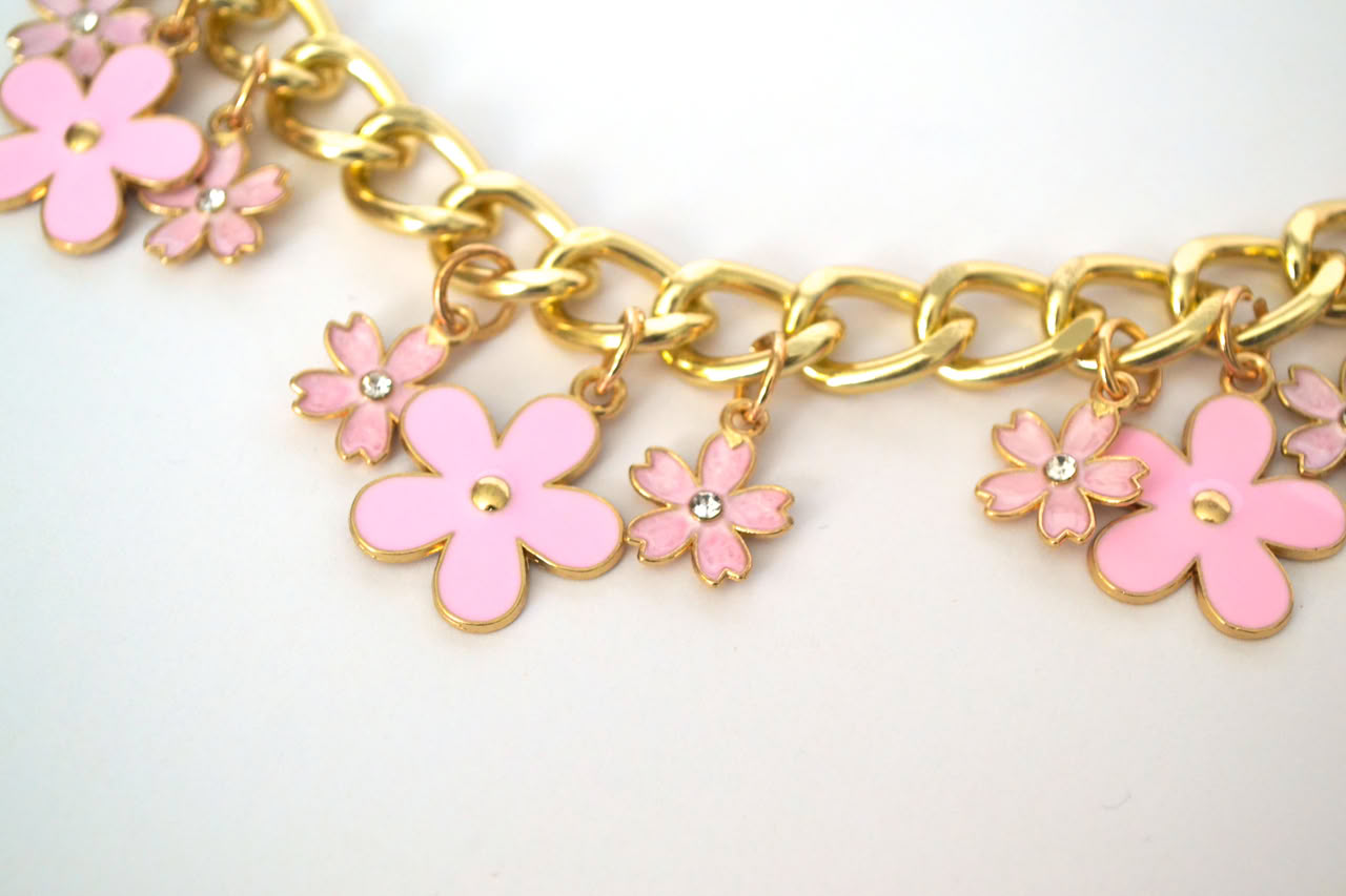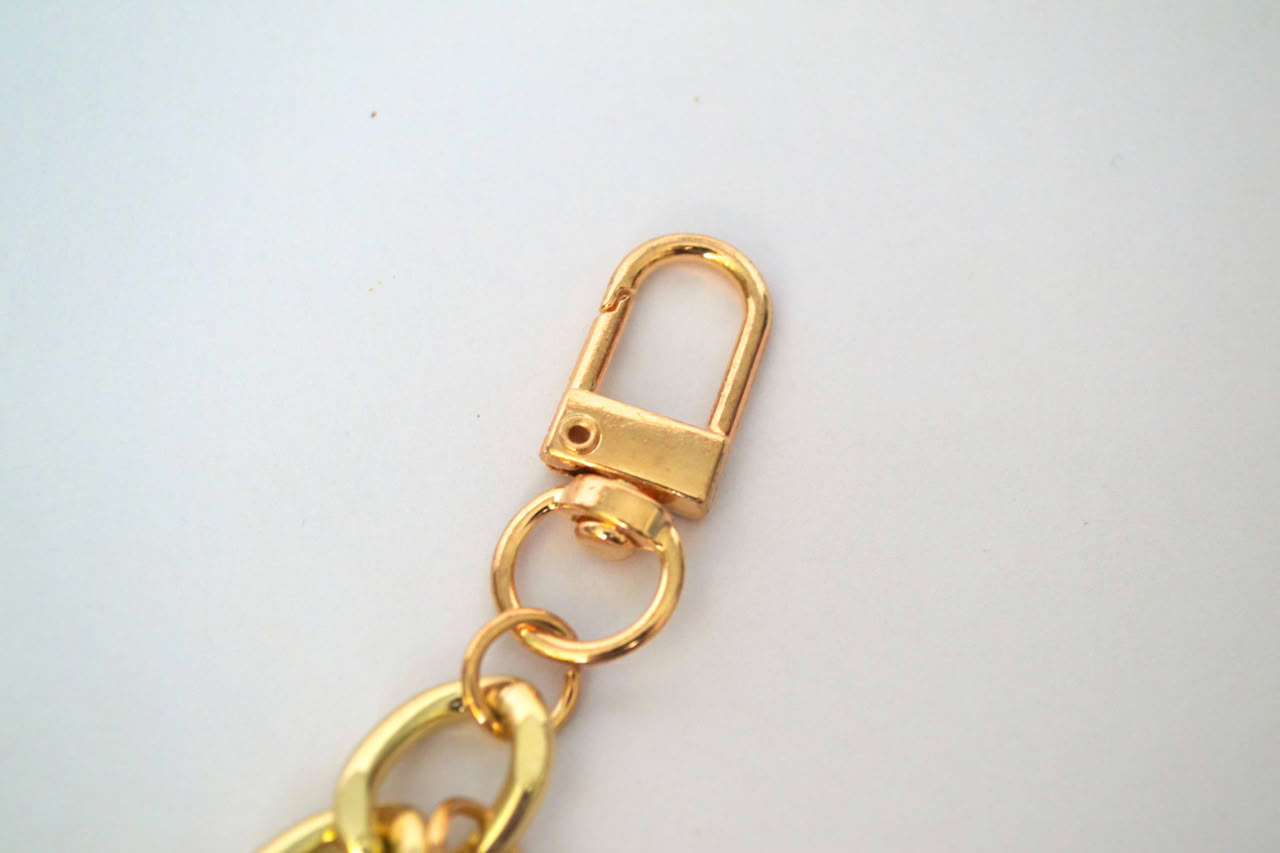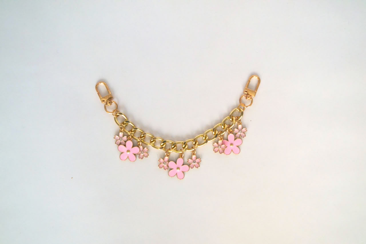 This short decorative chain features flower details and a sturdy metal finish. Designed as a decorative strap, it adds a accent to handbags and it is comportable for everyday use.