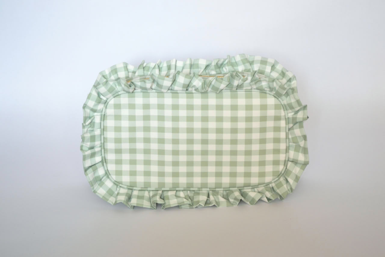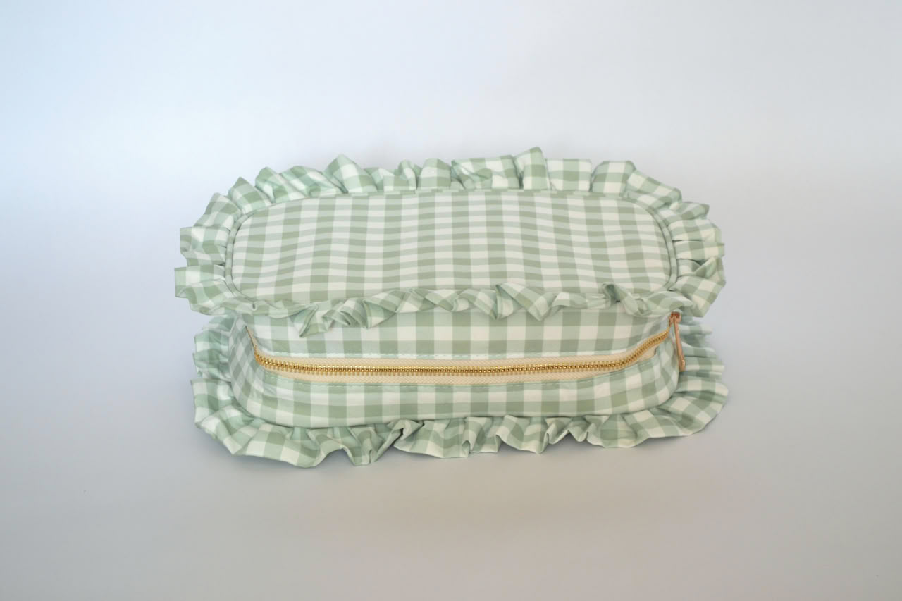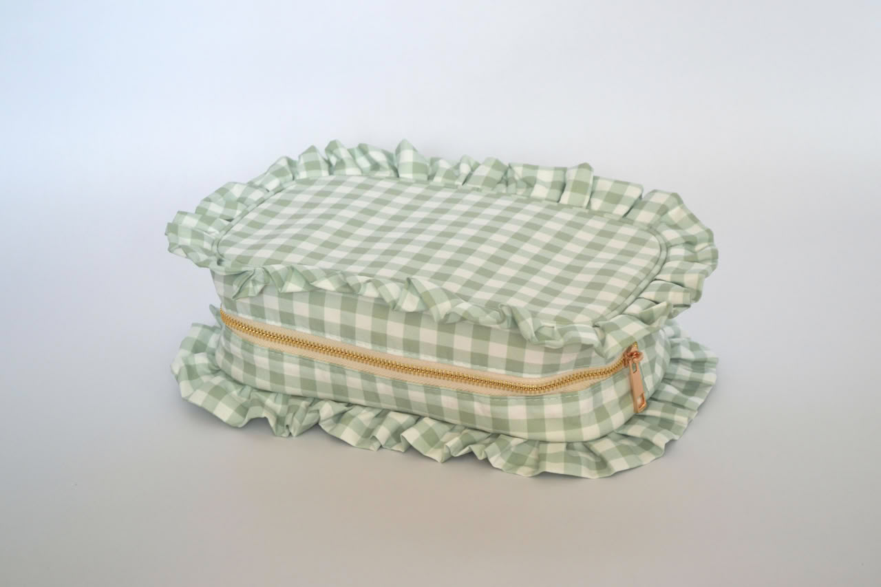 Large Capacity Portable Zipper Cosmetic Bag with Ruffle Gingham Plaid is made from durable fabric, it ensures reliable protection for cosmetics. Zipper closure provide secure storage for the cosmetics